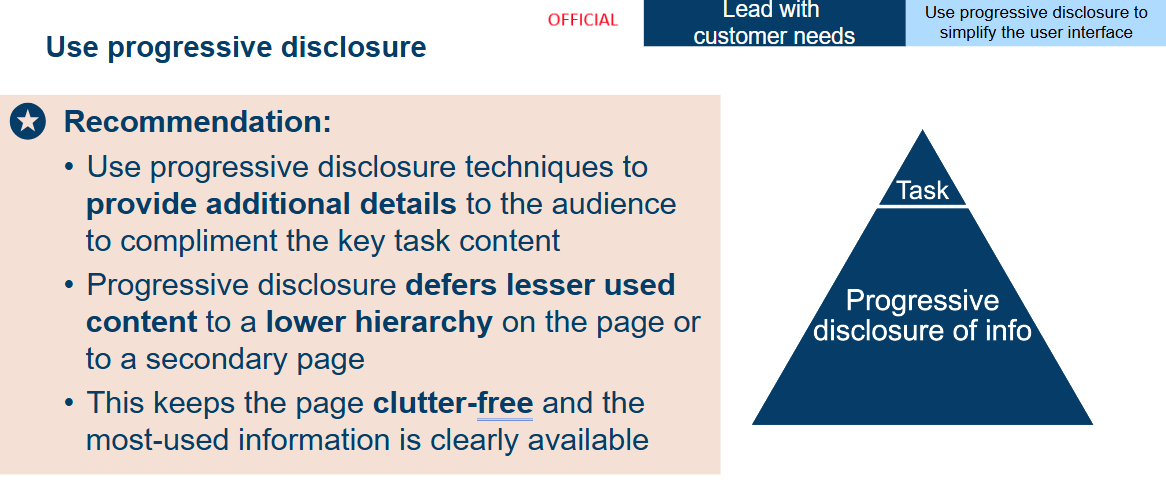 Progressive disclosure is a user experience (UX) design technique where only the most important information is shown first, revealing additional details or complex features only when the user requests them (e.g. clicking a button, expanding an accordion, or expanding a tab).