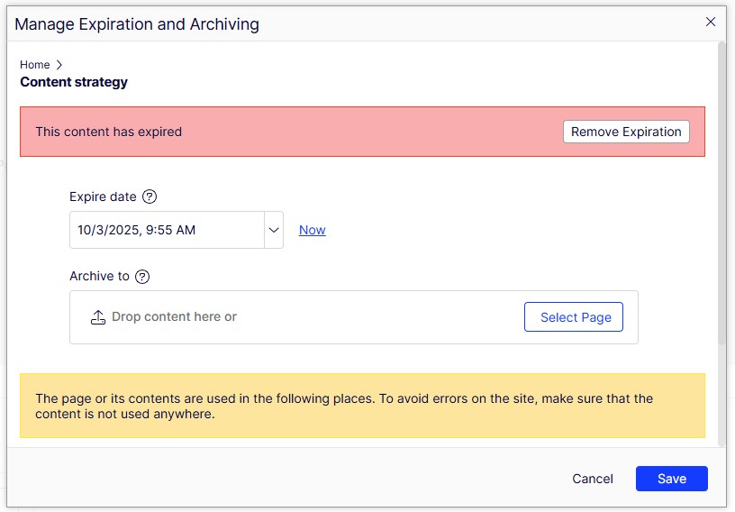 Expire a page or block so it's no longer live and doesn't show up on the website or search.